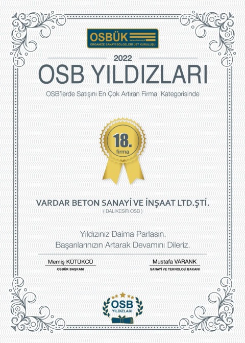 Firmamız Türkiye Organize Sanayi Bölgeleri üst kuruluşu OSBÜK tarafından düzenlenen OSB YILDIZLARI yarışmasında satışını en çok arttıran firmalar kategorisinde Türkiye 18'incisi olmuştur. Bu başarıda emeği geçen tüm personelimizi, tedarikçilerimizi, saygıdeğer müşterilerimizi kutlarız...